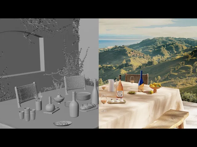 The team defined clear creative requirements, from lighting direction to precise food and wine pairings. Certain accessories were even custom-modeled in 3D to reflect their exact aesthetic.
